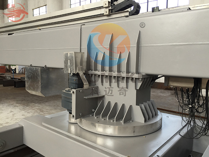 軌道式擦窗機(jī)的整個(gè)機(jī)構(gòu)安裝在一個(gè)能在水平軌道上行走的底盤(pán)上,靠行走底盤(pán)的運(yùn)動(dòng)來(lái)完成整個(gè)擦窗機(jī)的水平運(yùn)行。這種形式的擦窗機(jī)一般安裝于坡度不大的屋面上,與建筑物相對(duì)獨(dú)立且安全系數(shù)高。由于擦窗機(jī)的起升、回轉(zhuǎn)、卷?yè)P(yáng)等機(jī)構(gòu)靈活多樣,所以軌道式擦窗機(jī)能滿足大部分建筑物的要求,只要建筑物屋面預(yù)留出足夠的空間和允許荷載,其臂長(zhǎng)可以從幾米到幾十米,因配重隨著臂的增長(zhǎng)而增加,整機(jī)重量也由2~3噸至幾十噸不等,因此在建筑結(jié)構(gòu)設(shè)計(jì)時(shí)就須考慮擦窗機(jī)的集中荷載對(duì)屋面結(jié)構(gòu)的影響,增加必要的承重梁柱等結(jié)構(gòu),以滿足安裝擦窗機(jī)的必要條件。