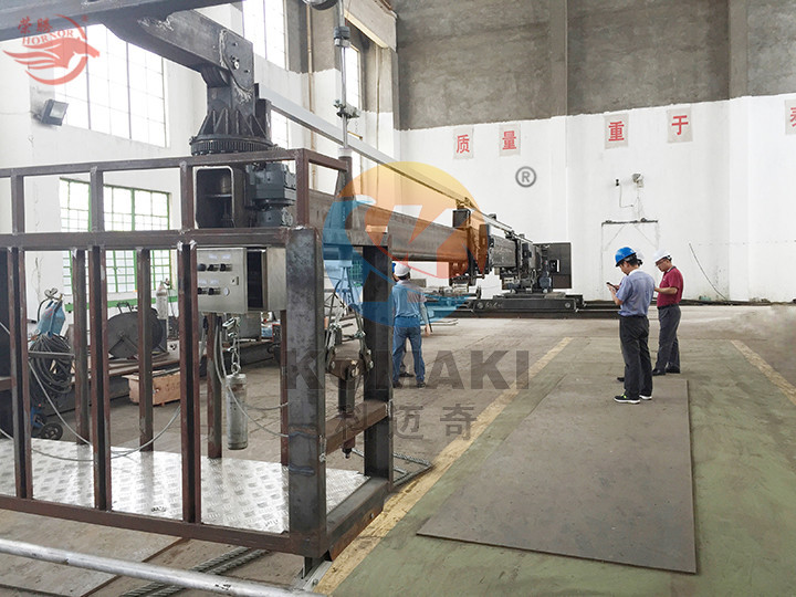 軌道式擦窗機的整個機構安裝在一個能在水平軌道上行走的底盤上,靠行走底盤的運動來完成整個擦窗機的水平運行。這種形式的擦窗機一般安裝于坡度不大的屋面上,與建筑物相對獨立且安全系數(shù)高。由于擦窗機的起升、回轉、卷揚等機構靈活多樣,所以軌道式擦窗機能滿足大部分建筑物的要求,只要建筑物屋面預留出足夠的空間和允許荷載,其臂長可以從幾米到幾十米,因配重隨著臂的增長而增加,整機重量也由2~3噸至幾十噸不等,因此在建筑結構設計時就須考慮擦窗機的集中荷載對屋面結構的影響,增加必要的承重梁柱等結構,以滿足安裝擦窗機的必要條件。