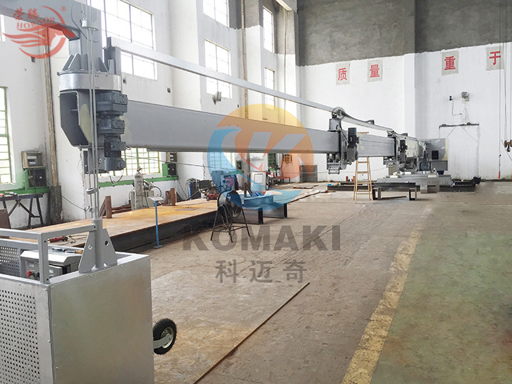 軌道式擦窗機(jī)的整個機(jī)構(gòu)安裝在一個能在水平軌道上行走的底盤上,靠行走底盤的運動來完成整個擦窗機(jī)的水平運行。這種形式的擦窗機(jī)一般安裝于坡度不大的屋面上,與建筑物相對獨立且安全系數(shù)高。由于擦窗機(jī)的起升、回轉(zhuǎn)、卷揚等機(jī)構(gòu)靈活多樣,所以軌道式擦窗機(jī)能滿足大部分建筑物的要求,只要建筑物屋面預(yù)留出足夠的空間和允許荷載,其臂長可以從幾米到幾十米,因配重隨著臂的增長而增加,整機(jī)重量也由2~3噸至幾十噸不等,因此在建筑結(jié)構(gòu)設(shè)計時就須考慮擦窗機(jī)的集中荷載對屋面結(jié)構(gòu)的影響,增加必要的承重梁柱等結(jié)構(gòu),以滿足安裝擦窗機(jī)的必要條件。